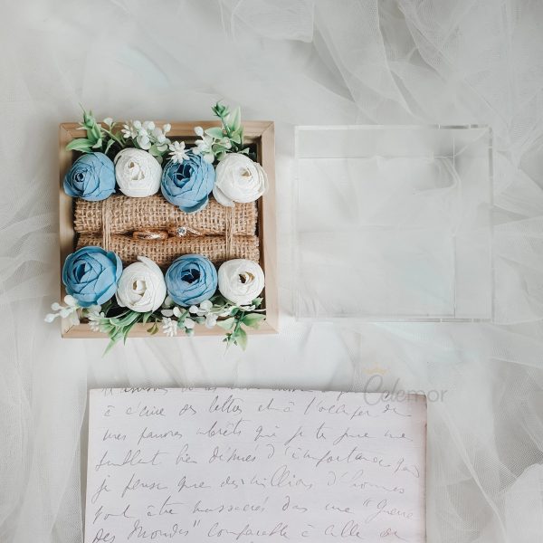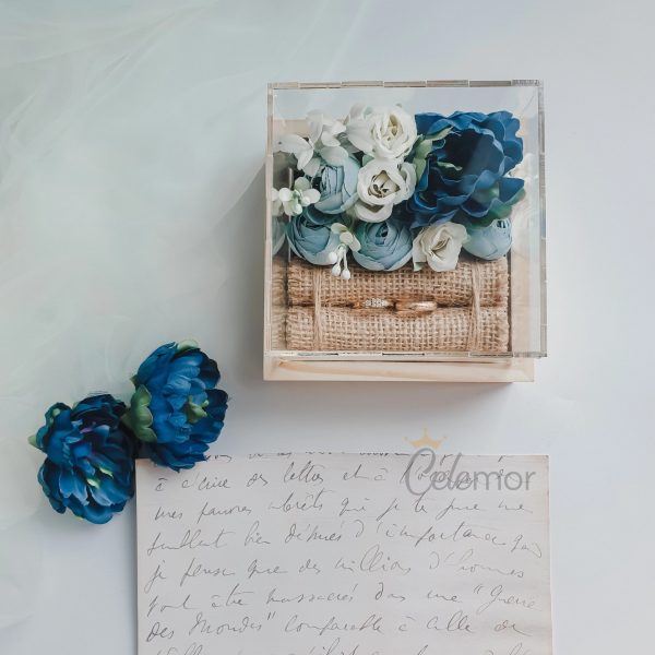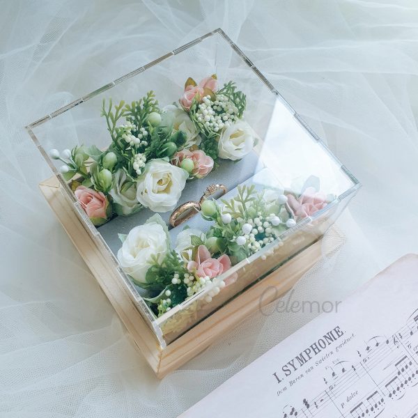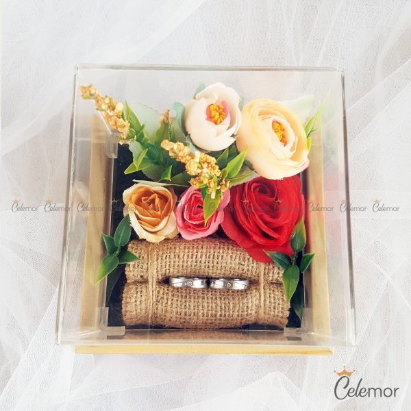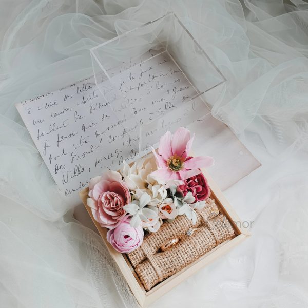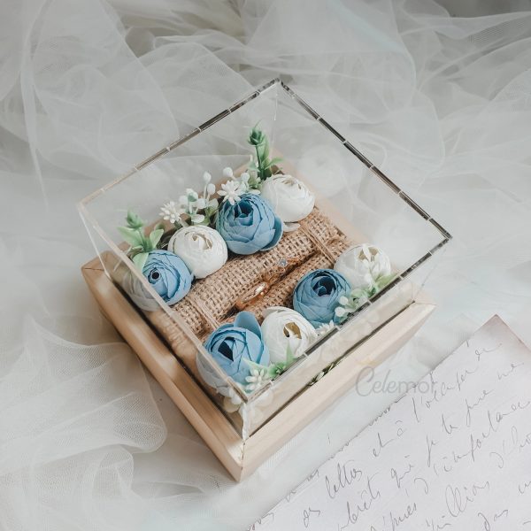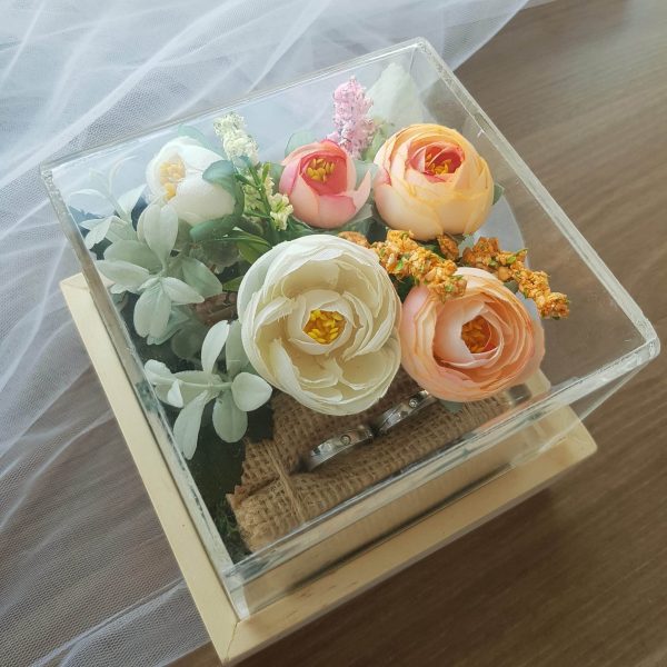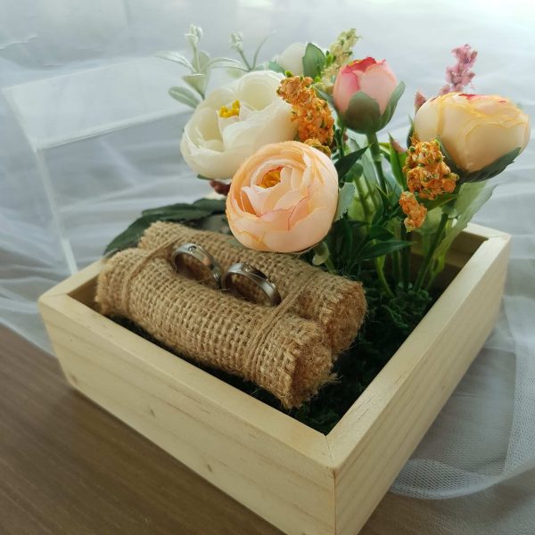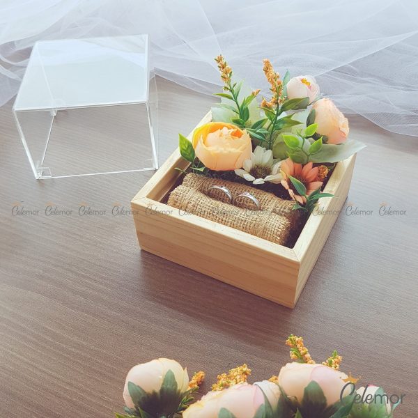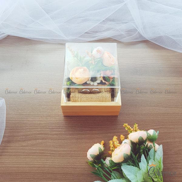Kotak cincin dari Jati Belanda finishing natural dengan akrilik di bagian tutup dan sisi-sisinya tanpa bingkai kayu untuk memberikan tampilan tanpa halangan.Harga sudah termasuk dekorasi dan dapat dibuat sesuai dengan keinginanmu.Tidak termasuk perhiasan.