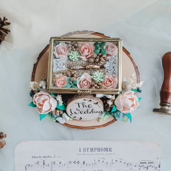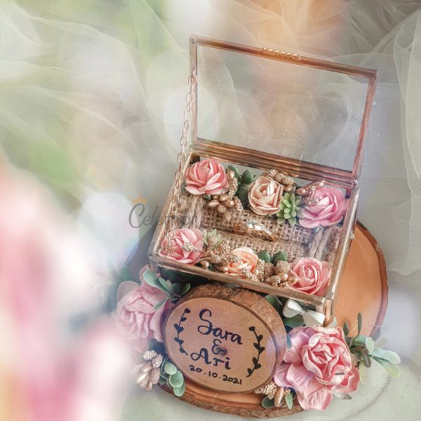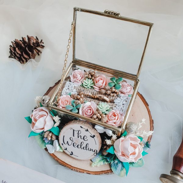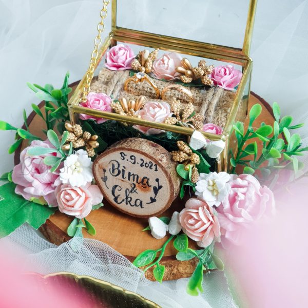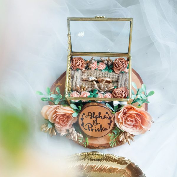 Tempat cincin dengan perpaduan terrarium segiempat dan alas kayu untuk memberikan sentuhan rustic.Harga sudah termasuk dekorasi dan dapat dibuat sesuai dengan keinginanmu.Tidak termasuk perhiasan.