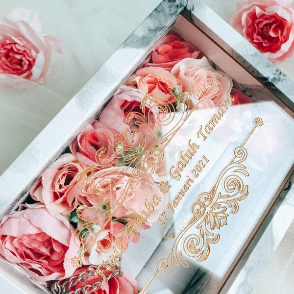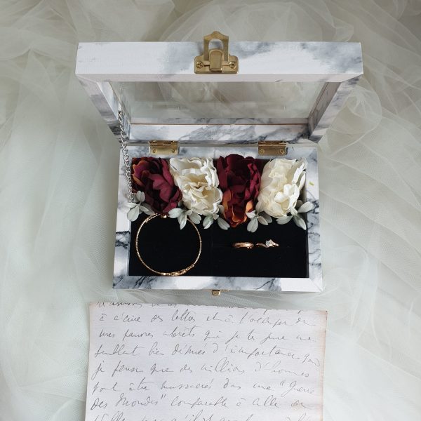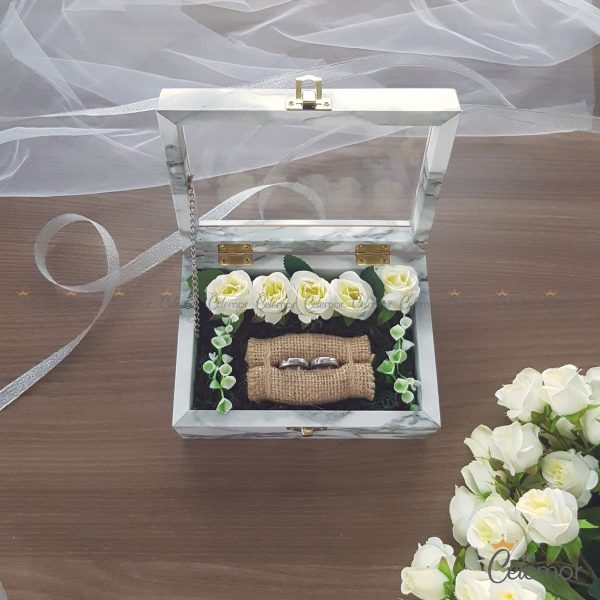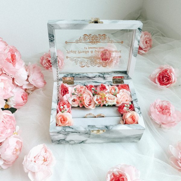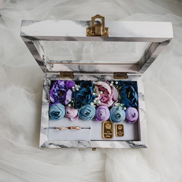 Kotak cincin dari Jati Belanda finishing marble dengan akrilik di bagian tutupnya untuk memberikan kesan elegan.Harga sudah termasuk dekorasi dan dapat dibuat sesuai dengan keinginanmu.Tidak termasuk perhiasan.