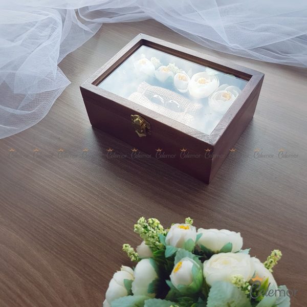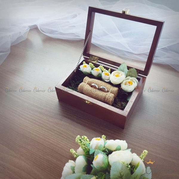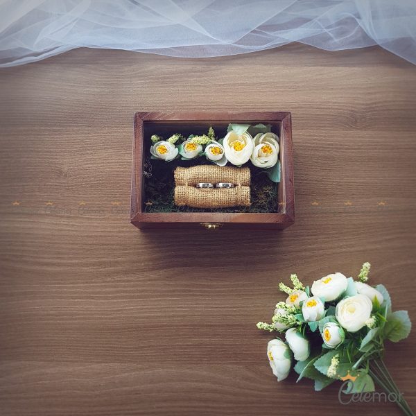 Kotak cincin dari Jati Belanda finishing politur coklat dengan akrilik di bagian tutupnya untuk memberikan detail klasik.Harga sudah termasuk dekorasi dan dapat dibuat sesuai dengan keinginanmu.Tidak termasuk perhiasan.